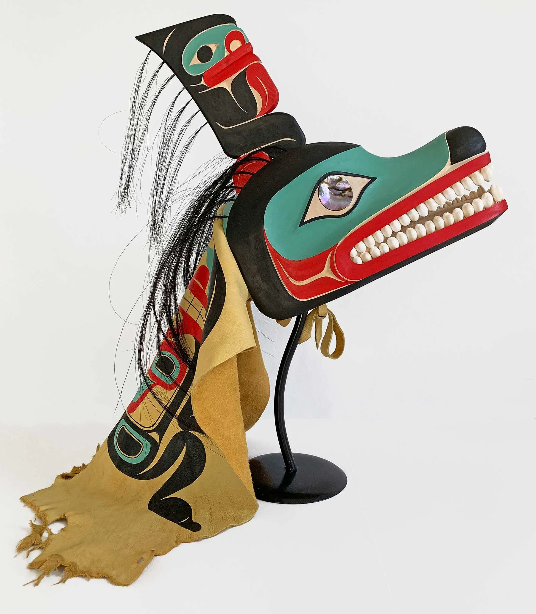 Gunakadeit Forehead Mask, carved from yellow cedar, Abalone, shell, horsehair, and deer hide. Gunakadeit is a Tlingit legend of a sea monster, a young man wore it’s skin to give him super natural powers. He used it’s powers to provide food for his village who was suffering from famine, and to appease his mother-in-law who had deemed him lazy. It represents “good fortune” and “prosperity” to those who see it.