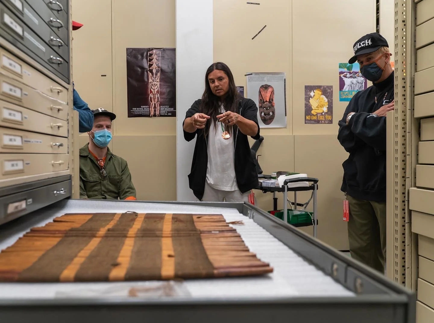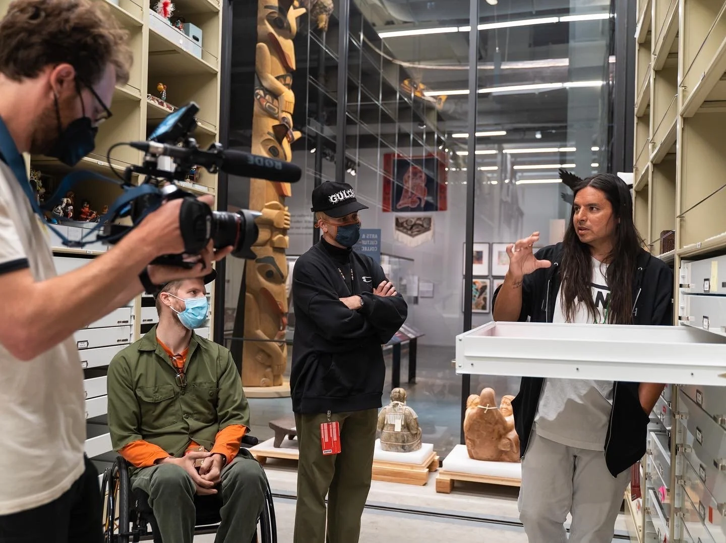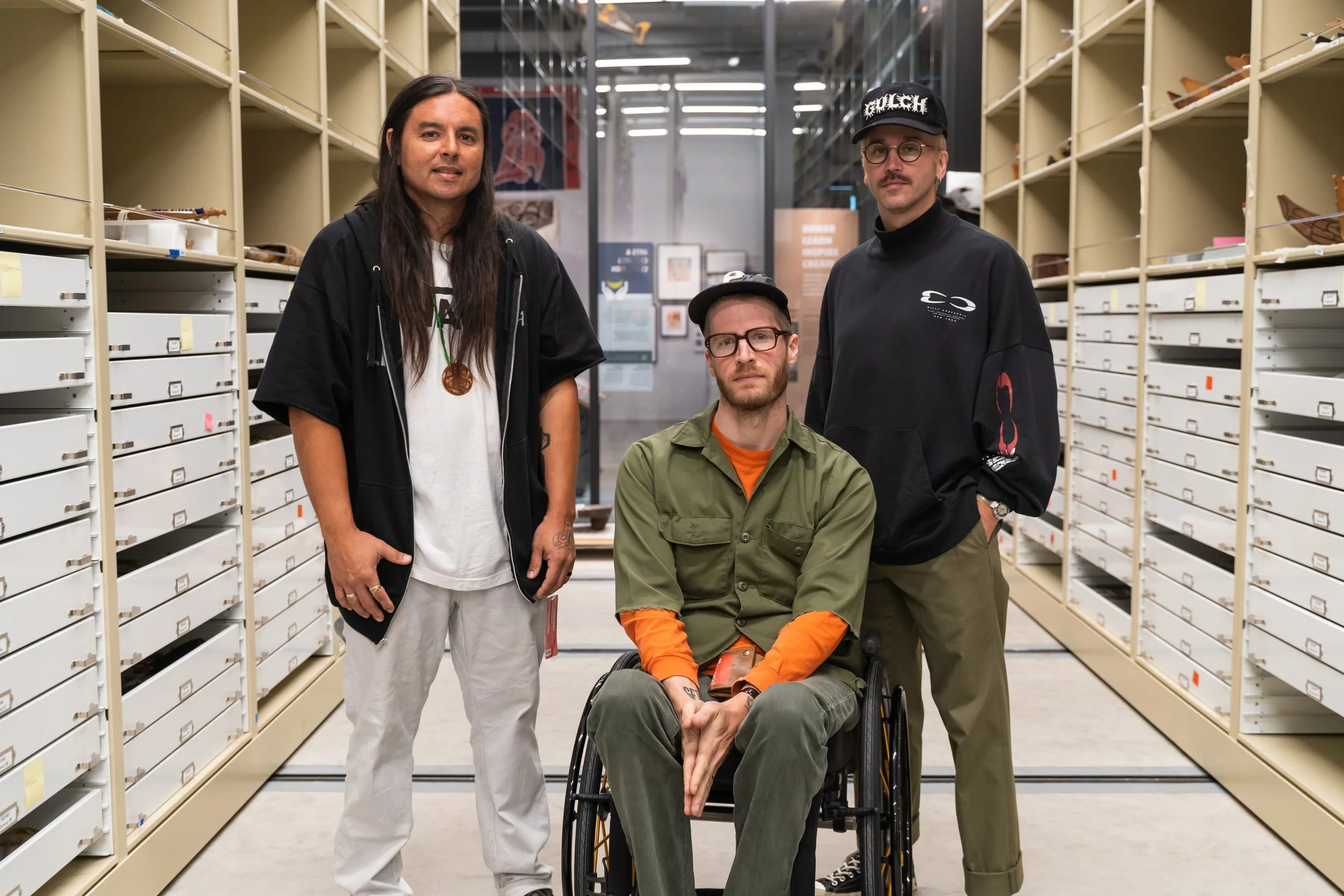 I have been a fan of the work Portugal The Man has been doing for Indigenous people for years. They provide an incredible platform for our voice to be heard. I’ve been fortunate to connect with the group, giving them Lib-Tech snowboards, small way of saying “thank you” for the work they’ve done. We connected at the Burke Museum in Seattle recently. I was there on a research grant to study their entire Tlingit collection. John Gourley asked me to do the art for their upcoming collaboration. It’s a Teton Gravity Research x Portugal The Man collection. We spent 2 days filming a film piece to highlight Tlingit art, and the history of our people. It was incredible.